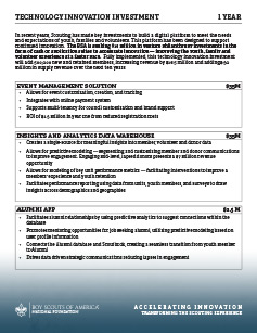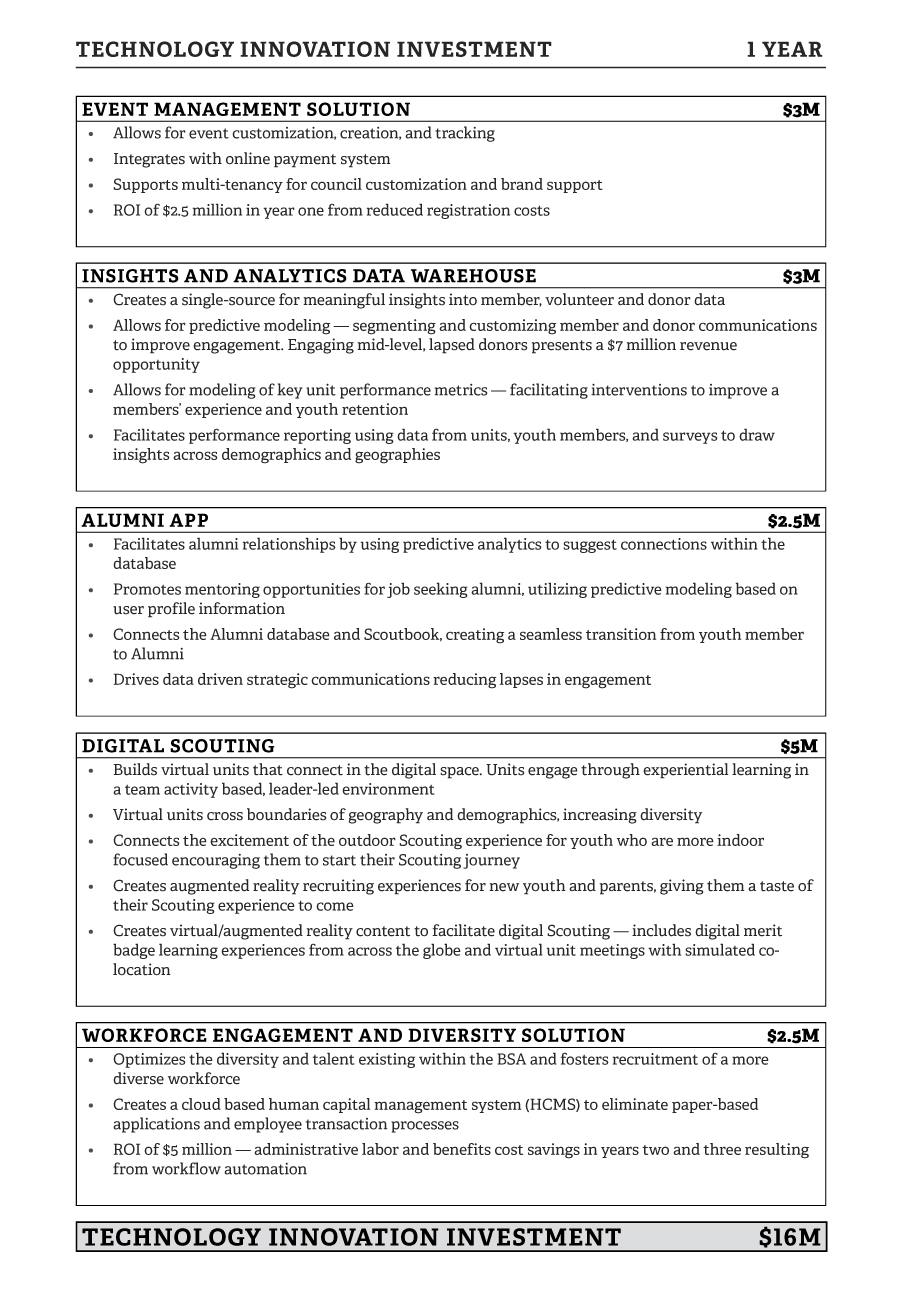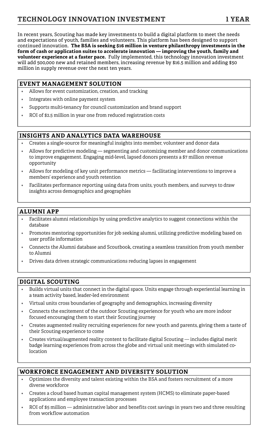 The BSA is seeking $16 million in venture philanthropy investments in the form of cash or application suites to accelerate innovation — improving the youth, family and volunteer experience at a faster pace. Fully implemented, this technology innovation investment will add 500,000 new and retained members, increasing revenue by $16.5 million and adding $50 million in supply revenue over the next ten years.